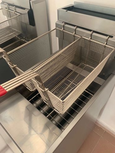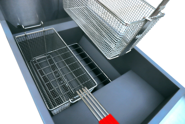 The convenient basket rails allow for quick removal from the fryer tank to drain away excess oil. They also allow you to hang the baskets at two different heights, which comes in handy when using one basket to collect items being fried with the other.